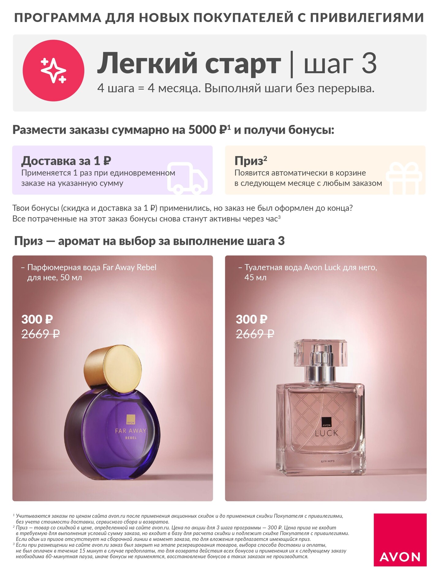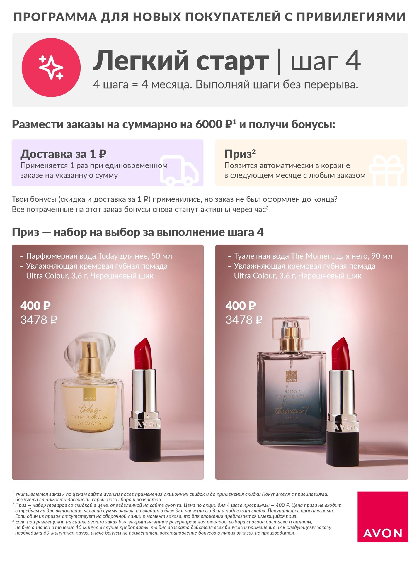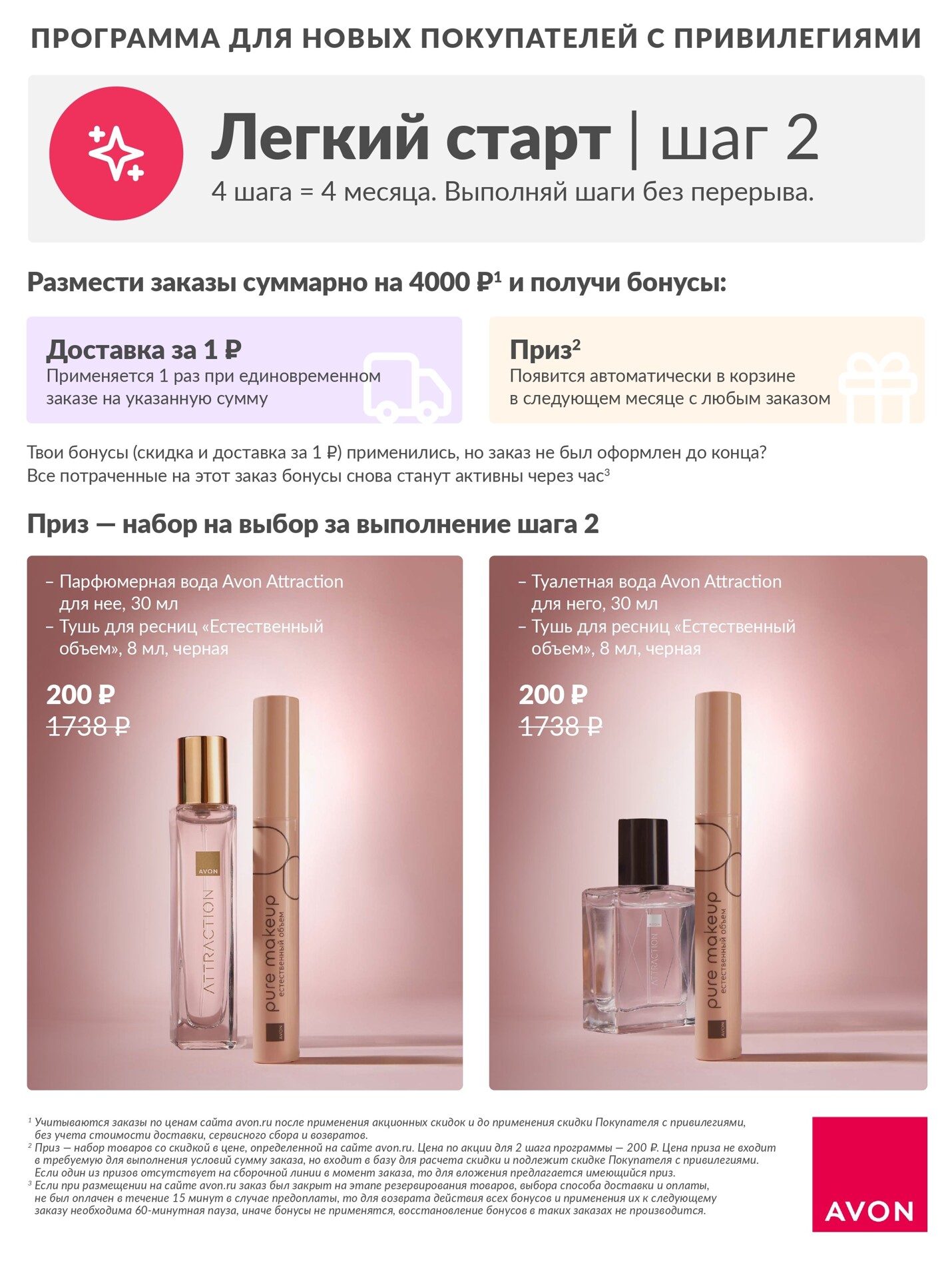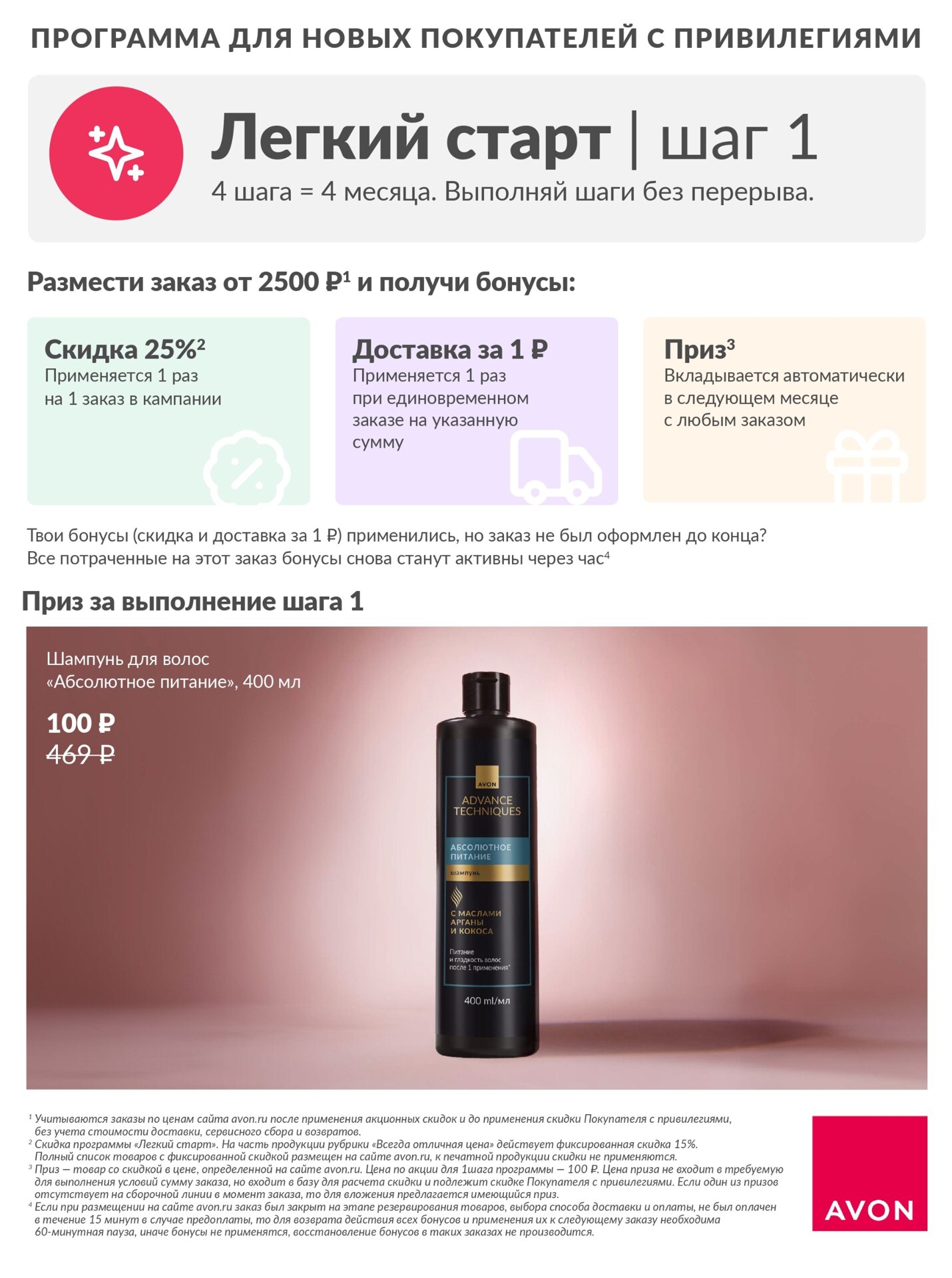 1. ШАГ. Разместите заказ от 2500 руб. до 28 февраля 21:00 по Мск времени. Вы получите привилегии первого шага программы "Легкий старт" для покупателя с привилегиями: 25% скидка на заказ, доставка заказа составит всего лишь 1 рубль, шампунь для волос 400мл с заказом по следующему каталогу (февраль). Участие в розыгрыше призов ежемесячно. Начиная с ШАГА 2 по ШАГ 4 - вы получаете продуктовые призы, включая скидку на заказ по каталогу и доставку за 1 рубль. Смотрите фото.